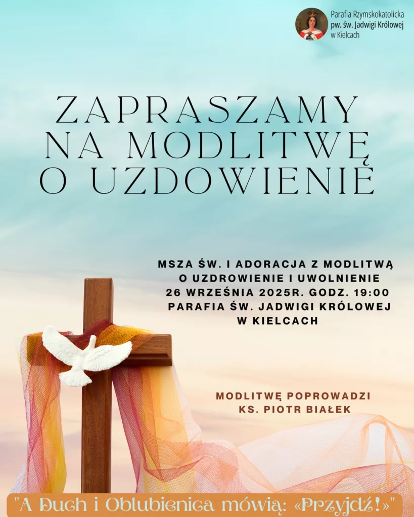 W najbliższy piątek, 26 września o godz. 19:00 zapraszamy do udziału we Mszy Świętej i adoracji z modlitwą o uzdrowienie i uwolnienie. Zapraszamy każdego, kto potrzebuje modlitwy wstawienniczej.