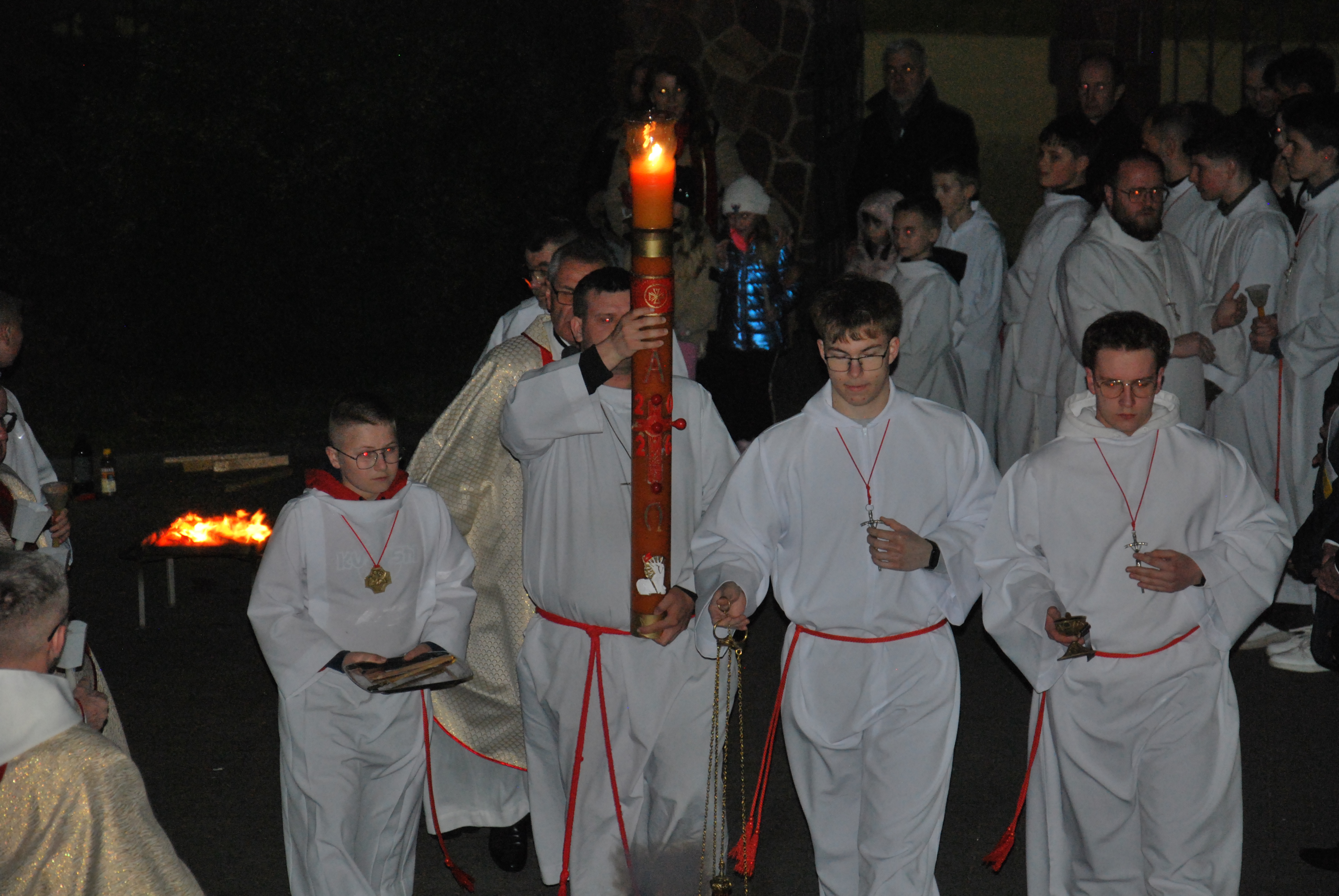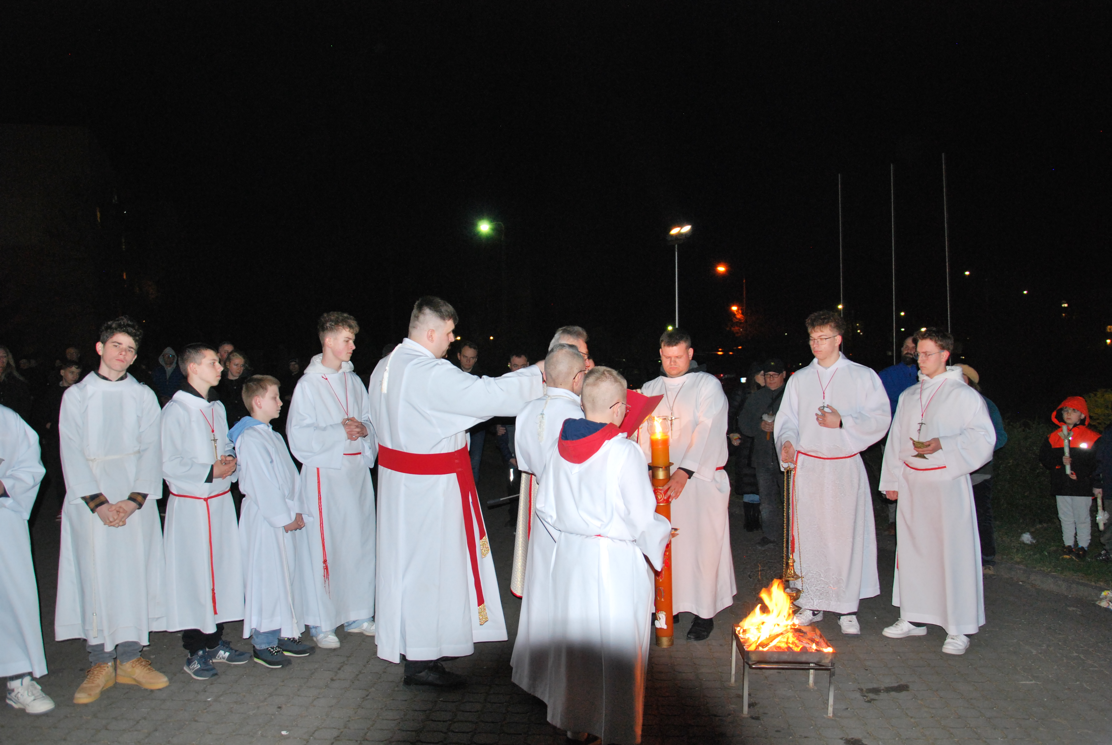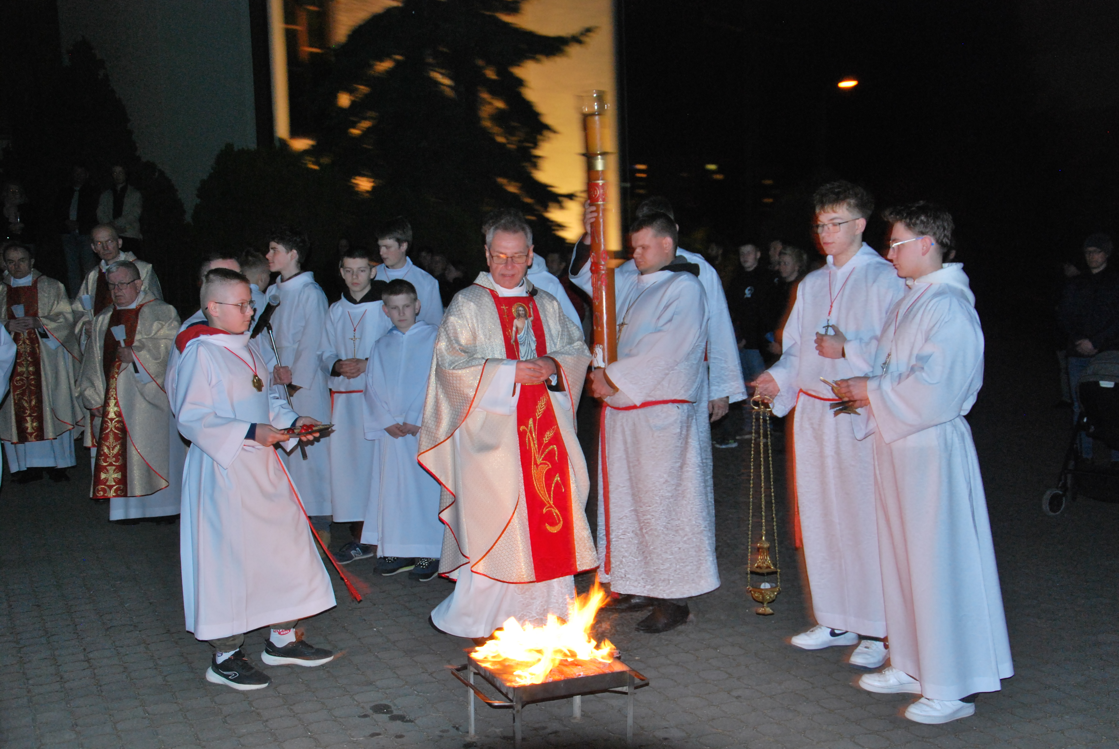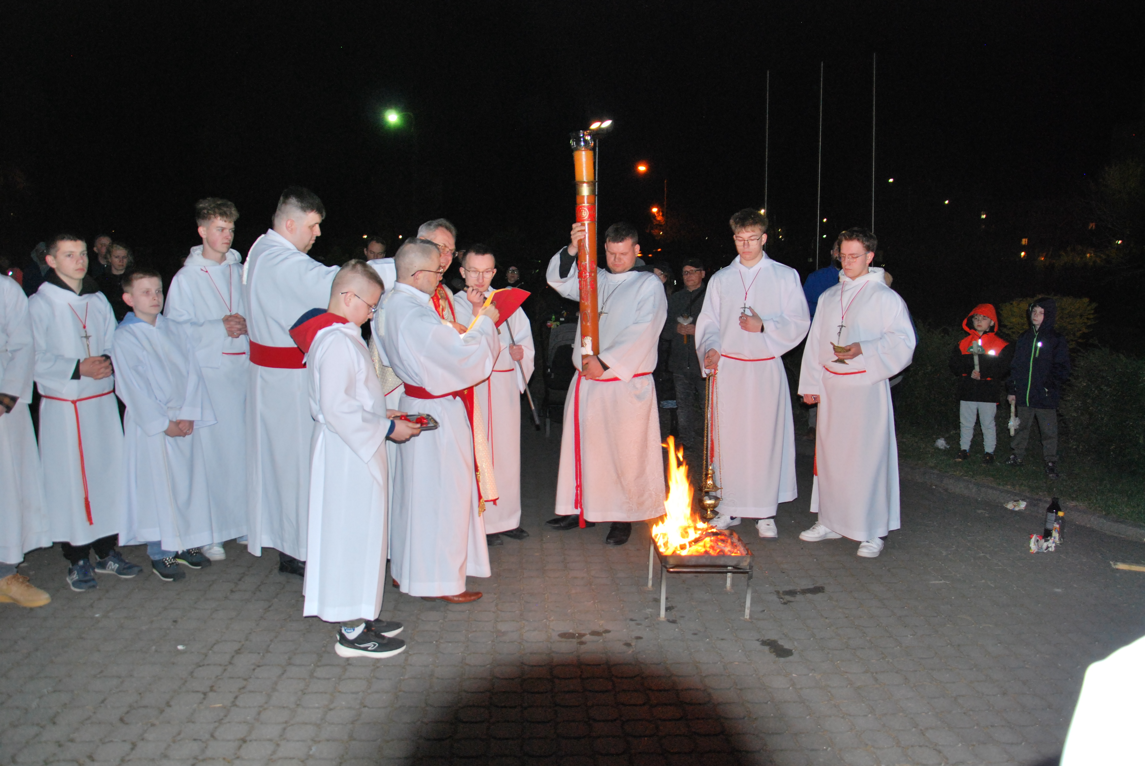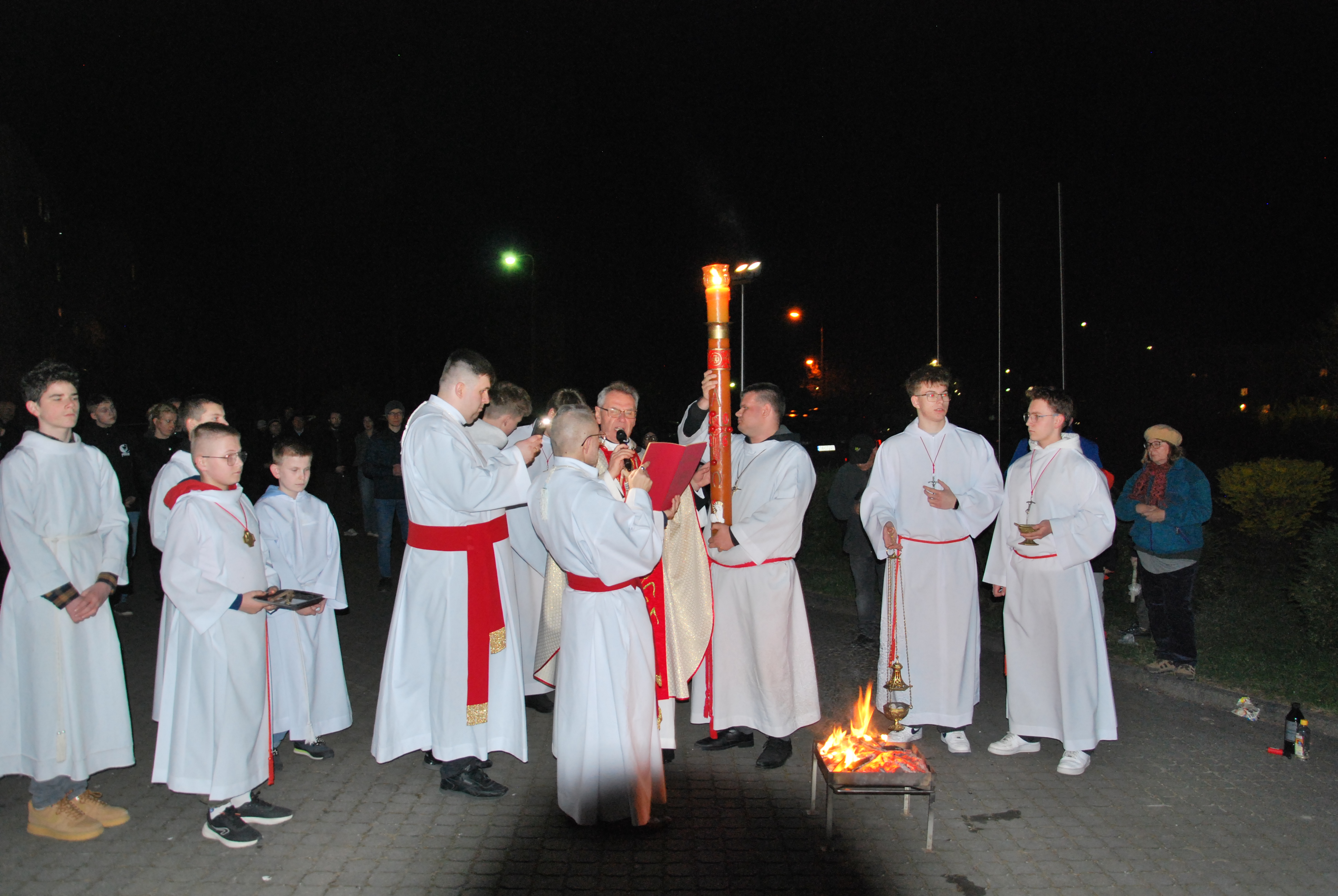 Liturgia rozpoczęła się na zewnątrz świątyni od obrzędu poświęcenia ognia. Od nowego ognia zapalono paschał – świecę symbolizującą Chrystusa Zmartwychwstałego, Światłość świata. Następnie w procesji wniesiono go do ciemnego kościoła, a światło stopniowo przekazywano wiernym, rozpraszając mrok i wprowadzając zgromadzonych w tajemnicę zwycięstwa życia nad śmiercią.