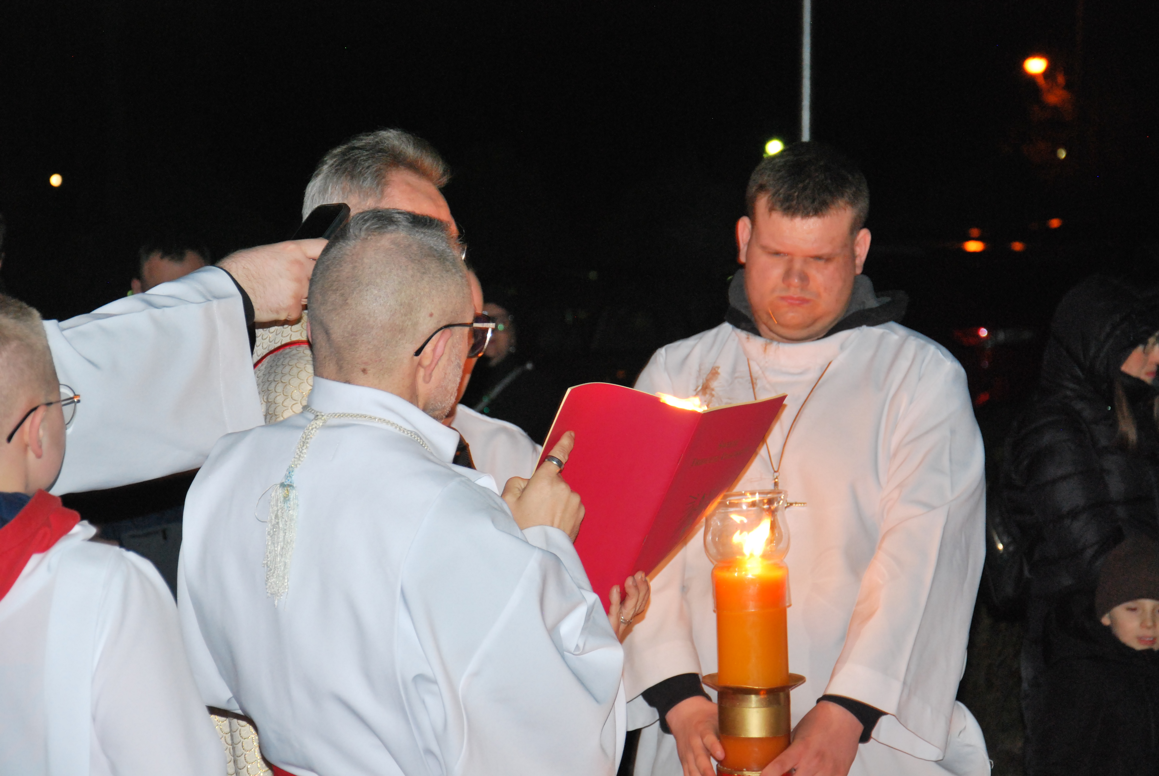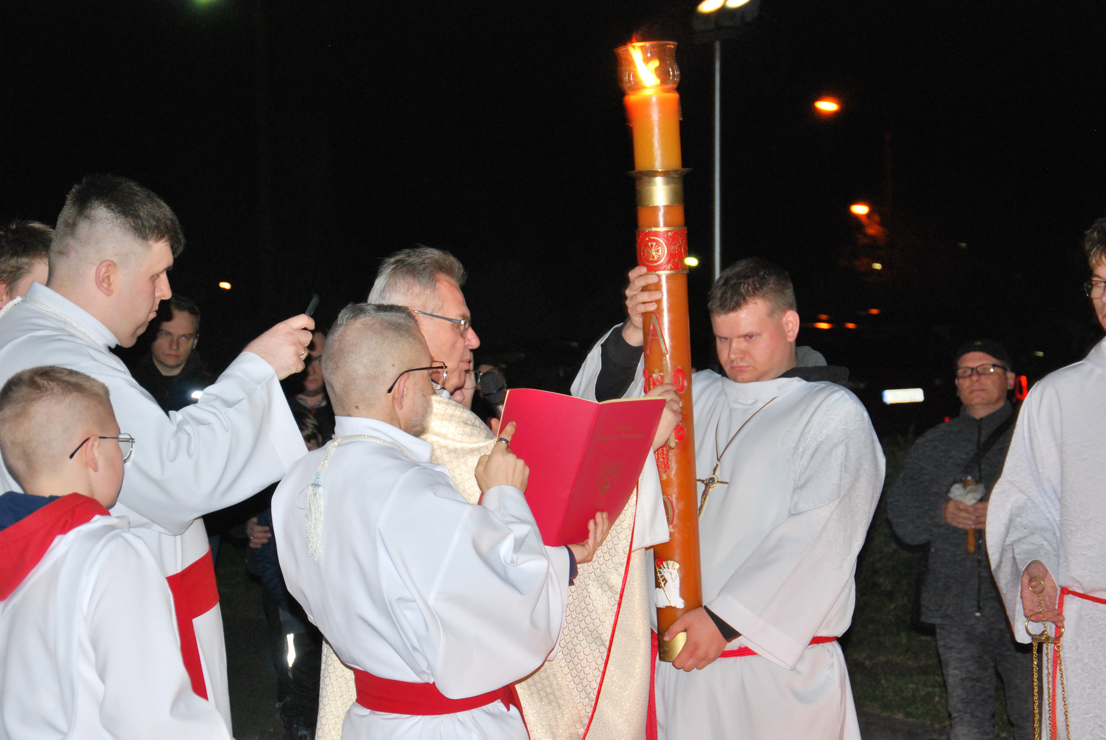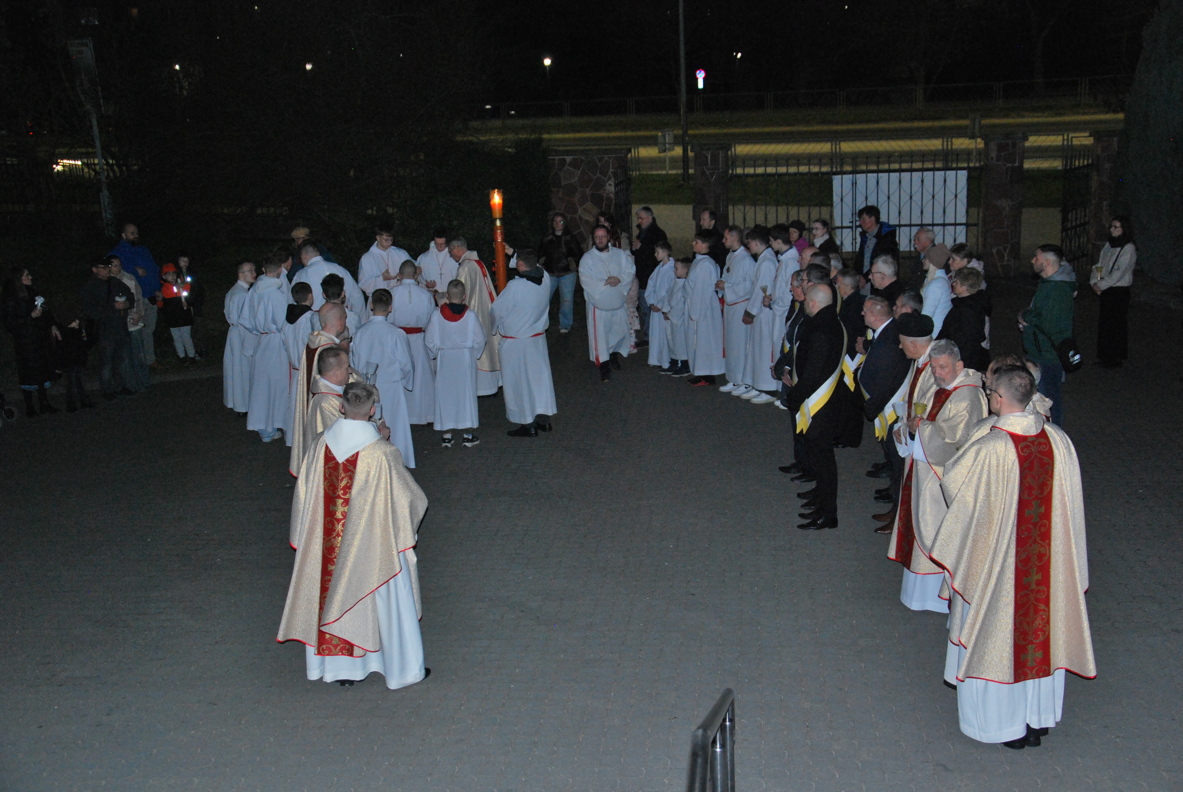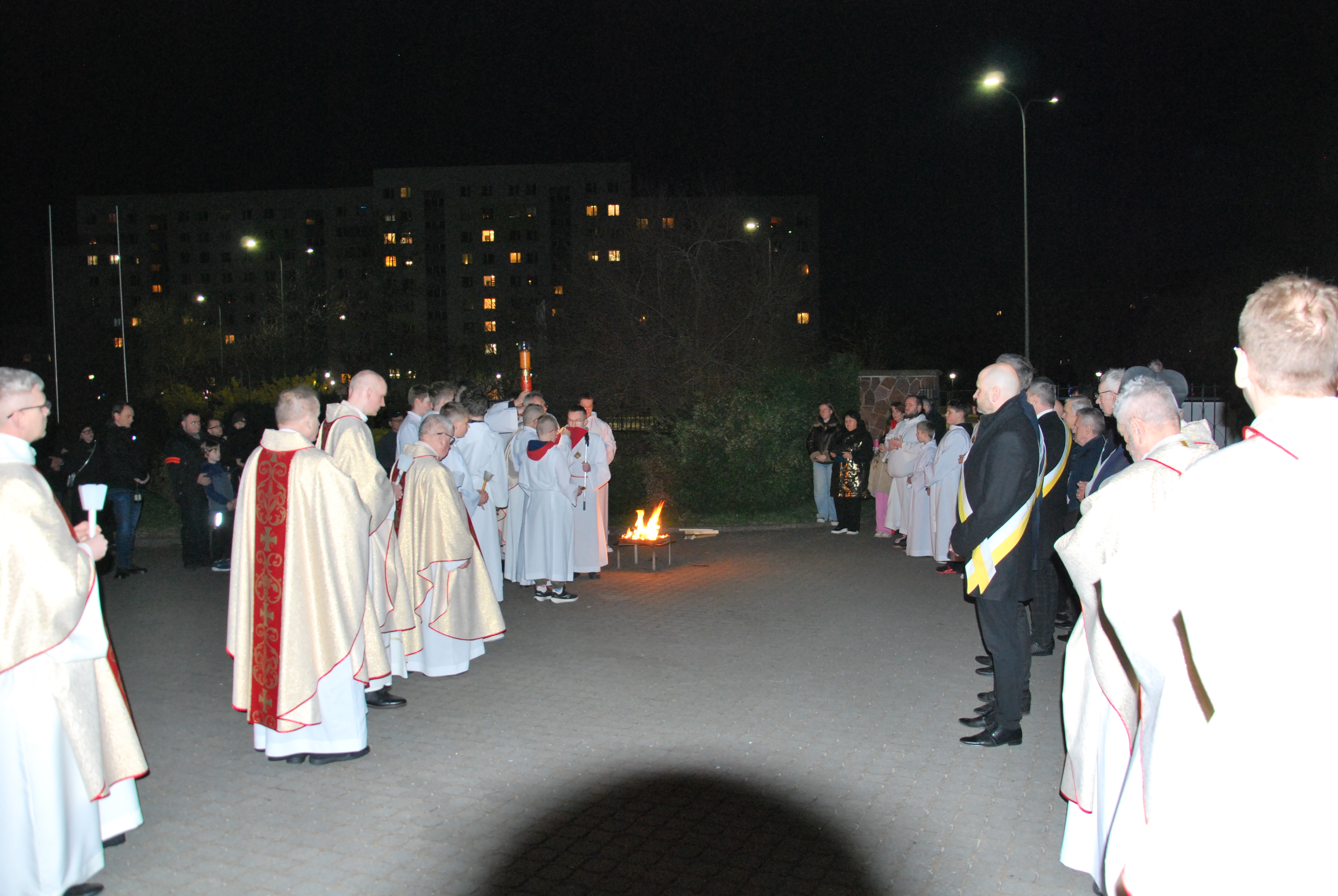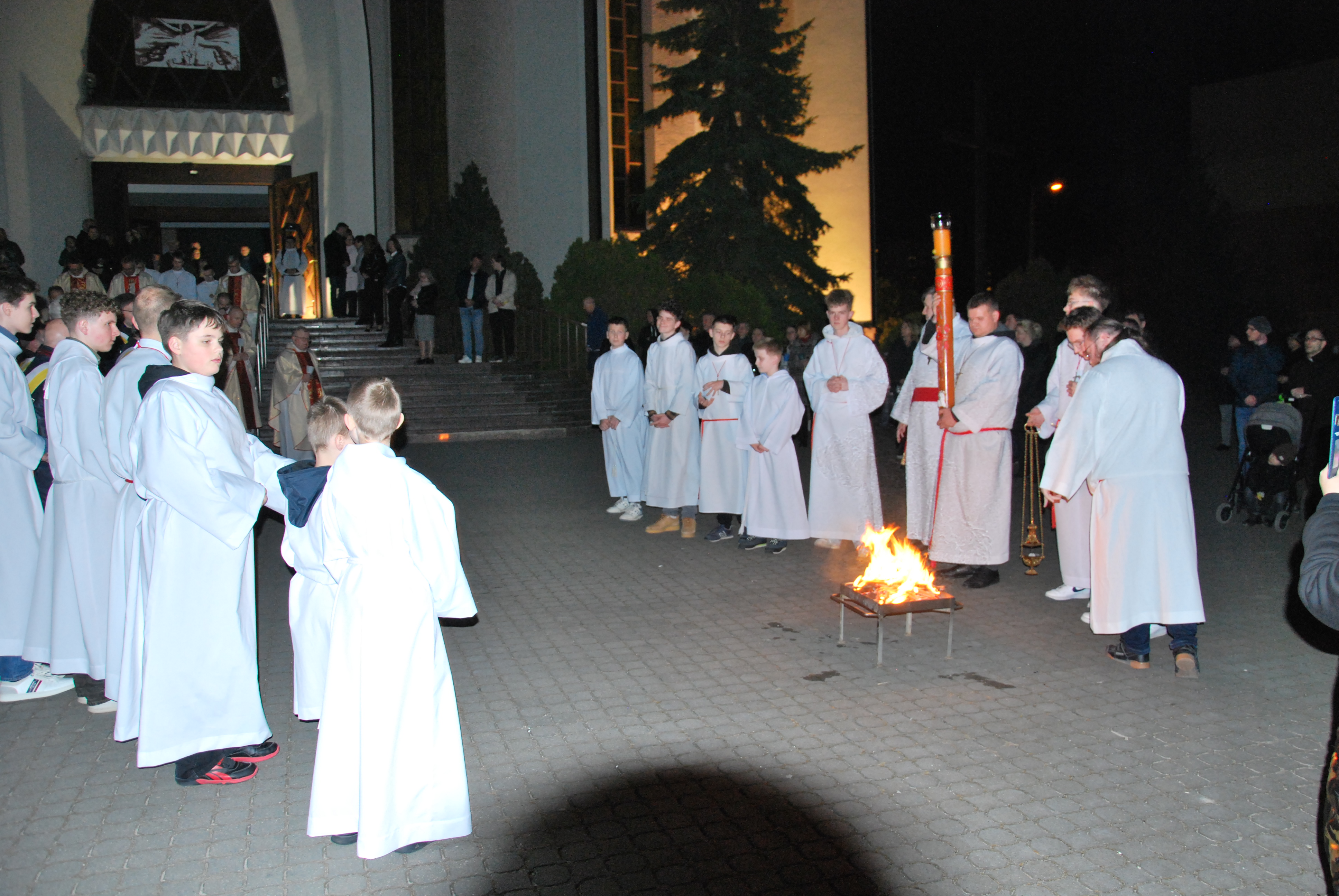 Liturgia rozpoczęła się na zewnątrz świątyni od obrzędu poświęcenia ognia. Od nowego ognia zapalono paschał – świecę symbolizującą Chrystusa Zmartwychwstałego, Światłość świata. Następnie w procesji wniesiono go do ciemnego kościoła, a światło stopniowo przekazywano wiernym, rozpraszając mrok i wprowadzając zgromadzonych w tajemnicę zwycięstwa życia nad śmiercią.