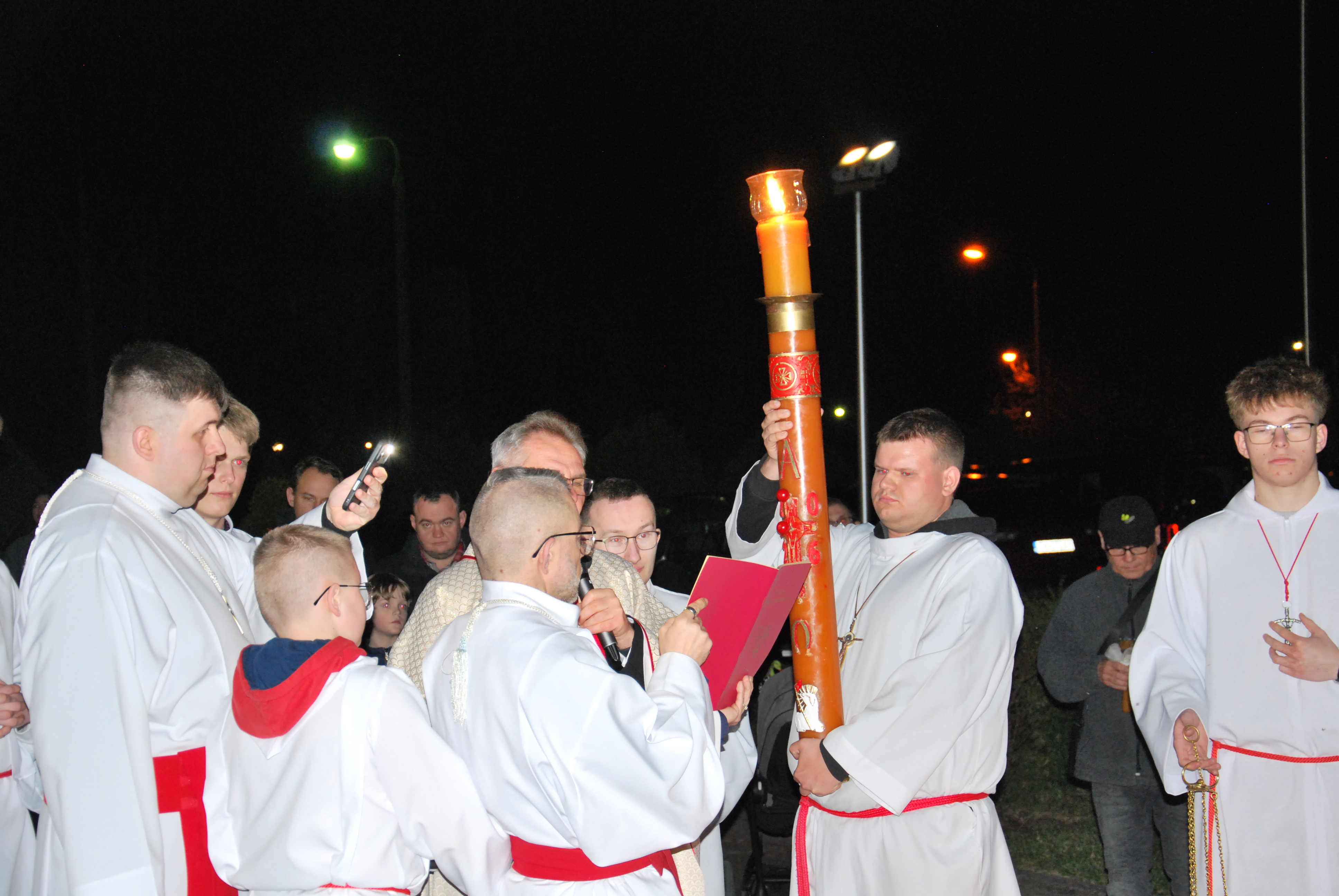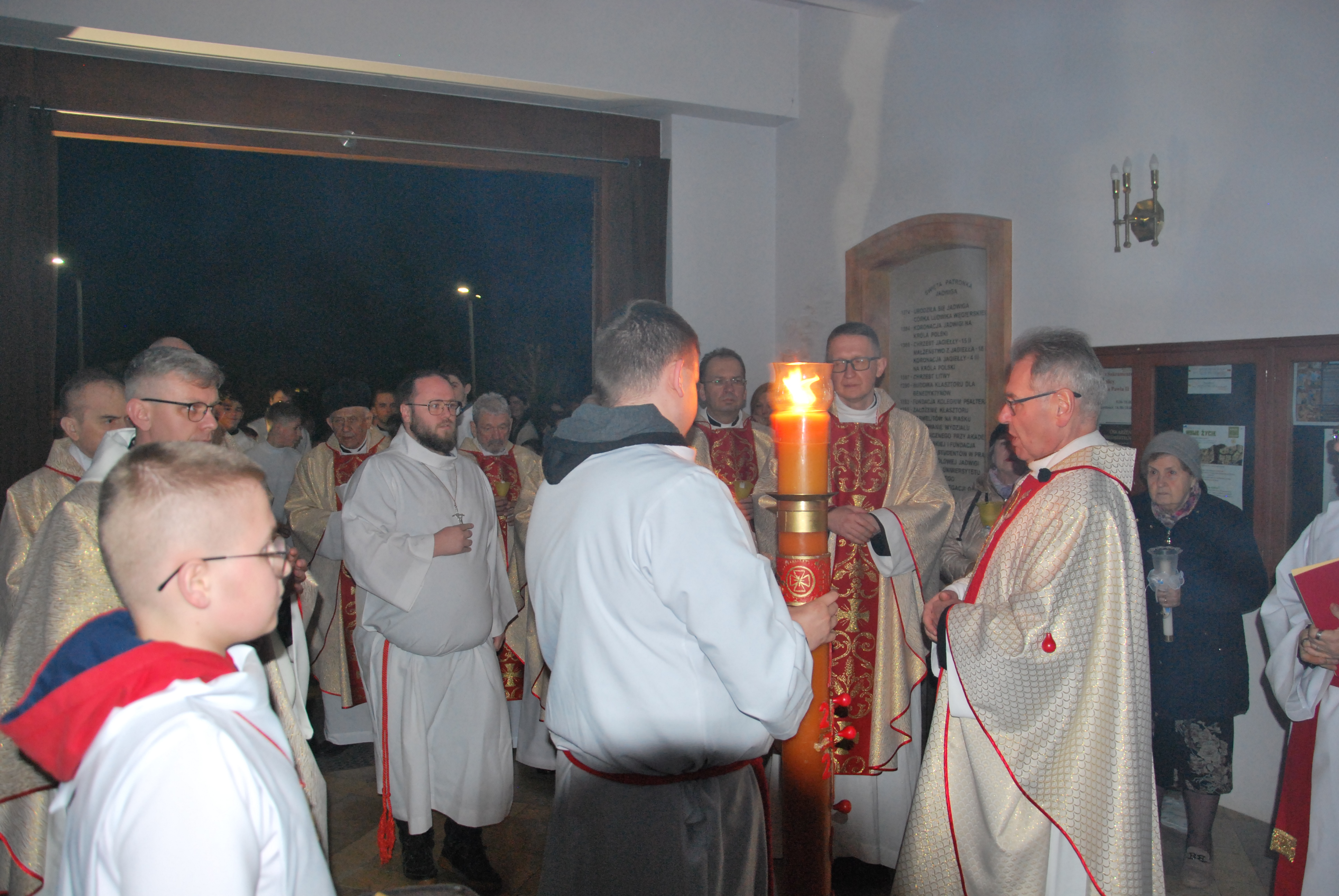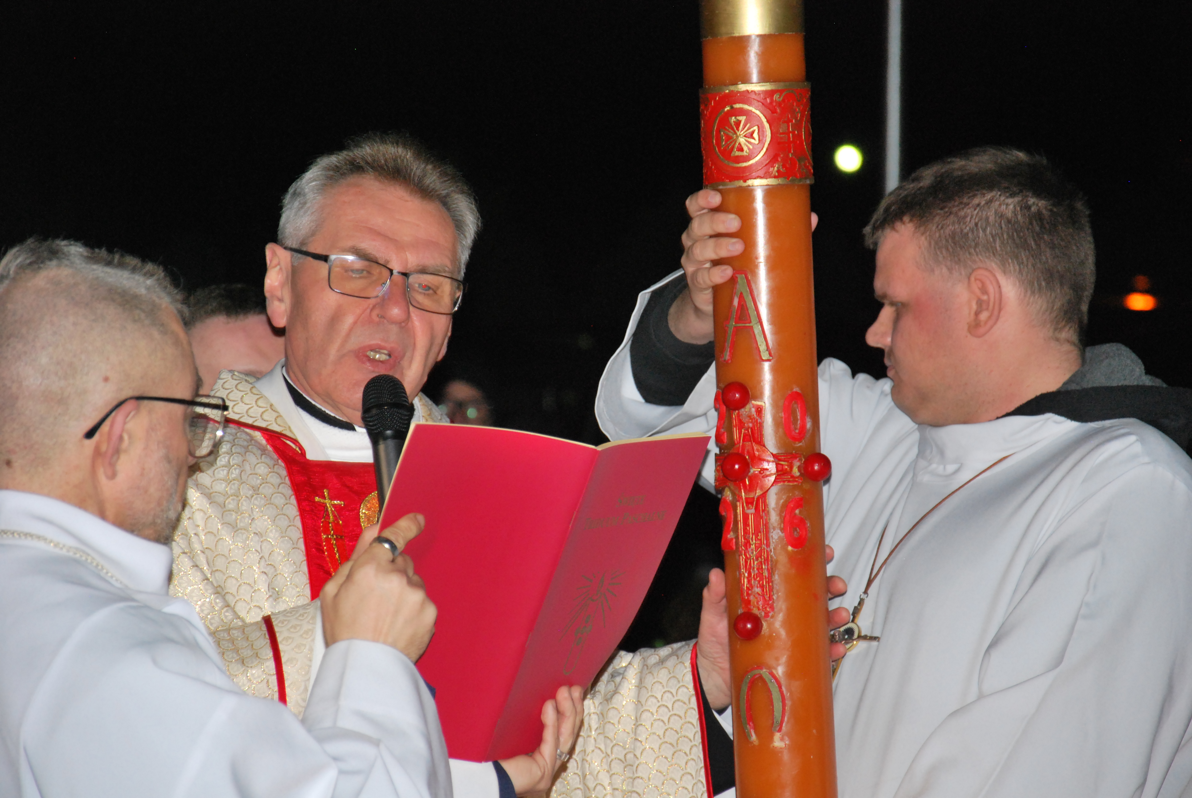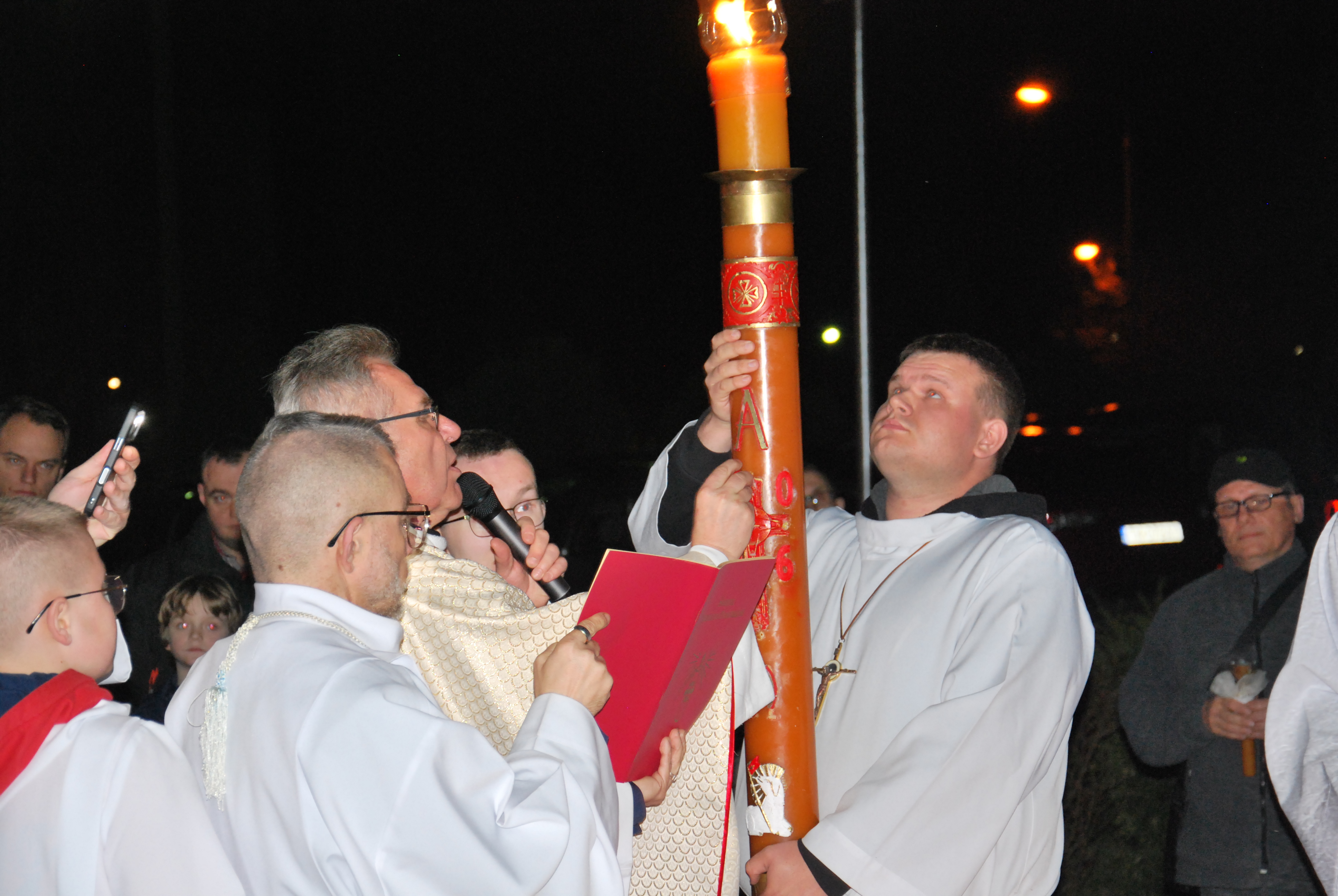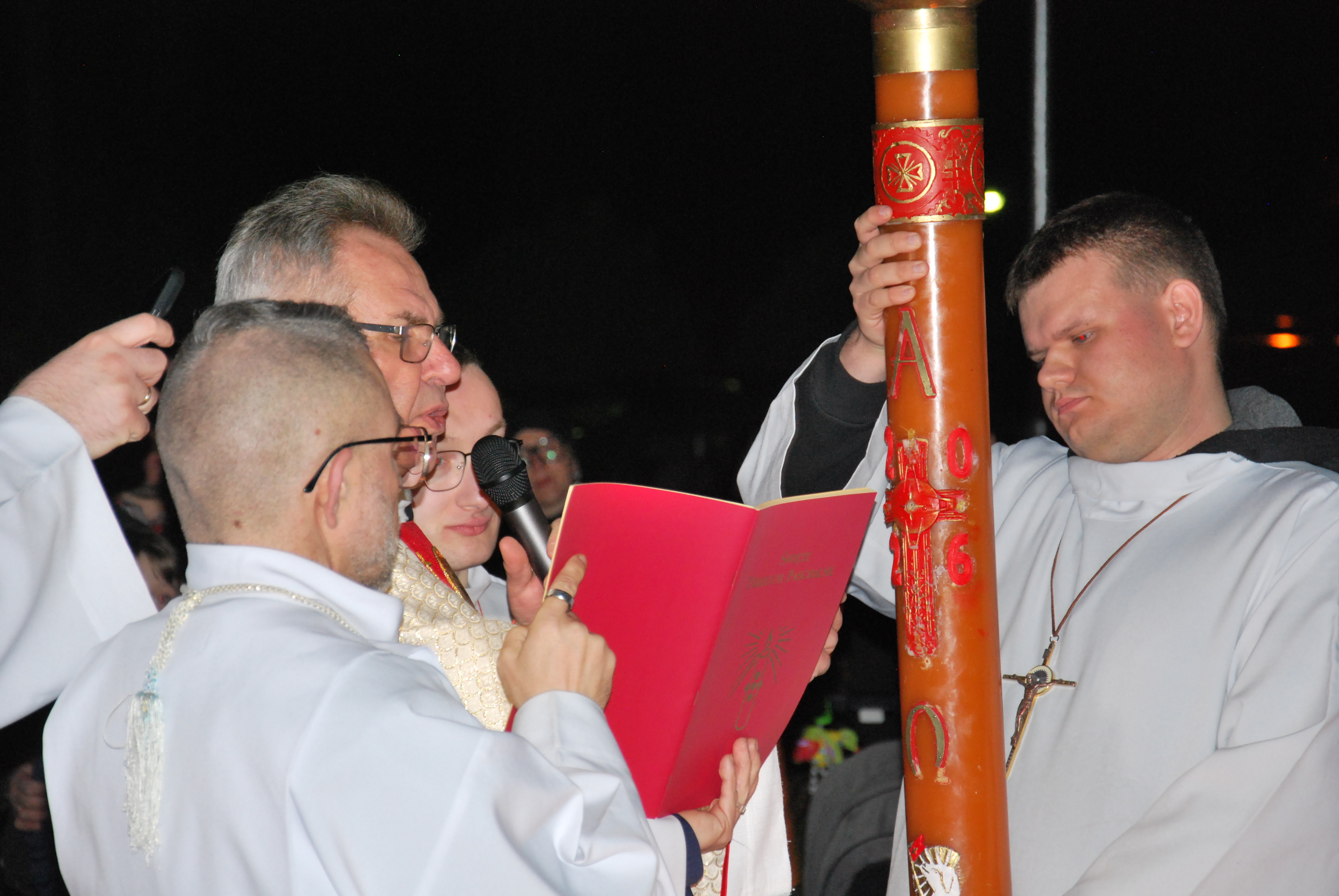 Liturgia rozpoczęła się na zewnątrz świątyni od obrzędu poświęcenia ognia. Od nowego ognia zapalono paschał – świecę symbolizującą Chrystusa Zmartwychwstałego, Światłość świata. Następnie w procesji wniesiono go do ciemnego kościoła, a światło stopniowo przekazywano wiernym, rozpraszając mrok i wprowadzając zgromadzonych w tajemnicę zwycięstwa życia nad śmiercią.