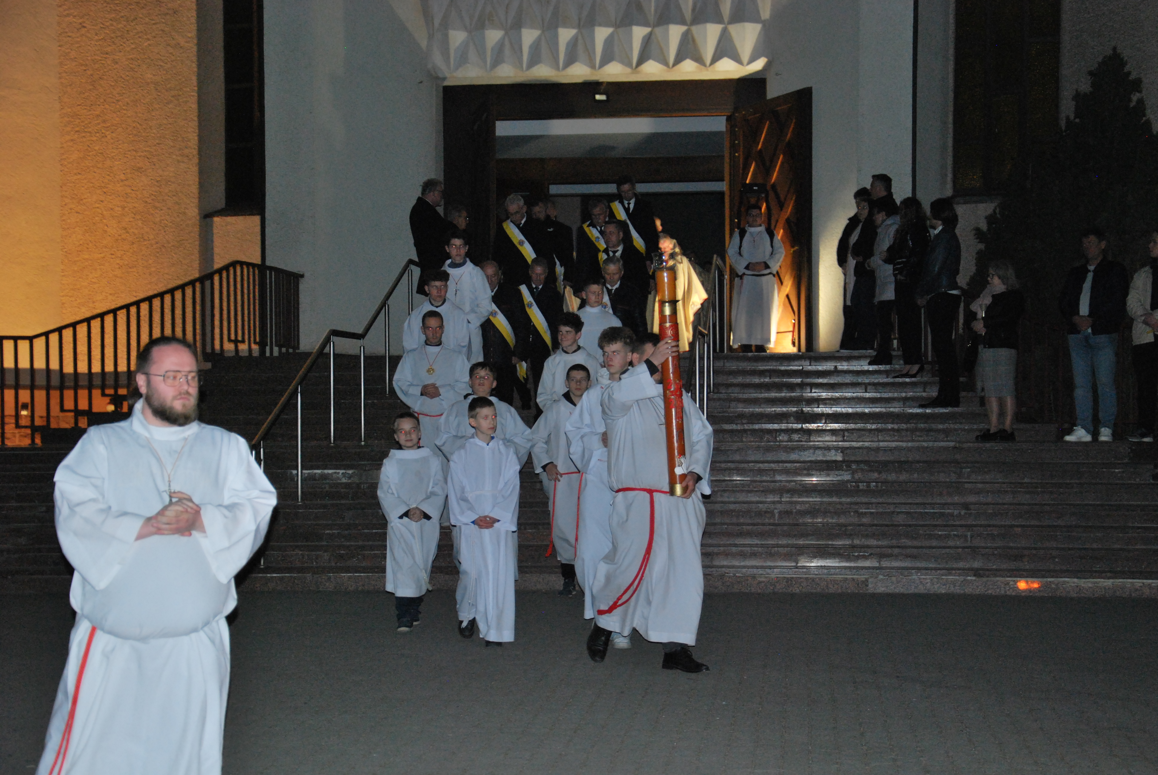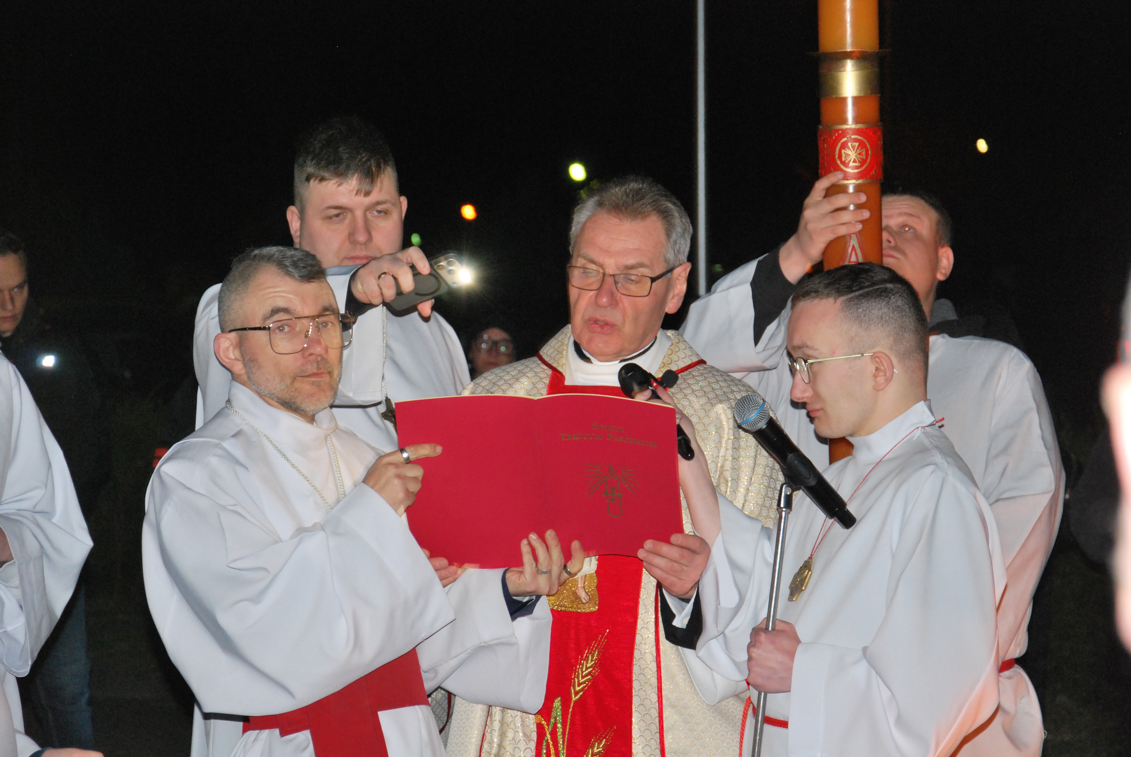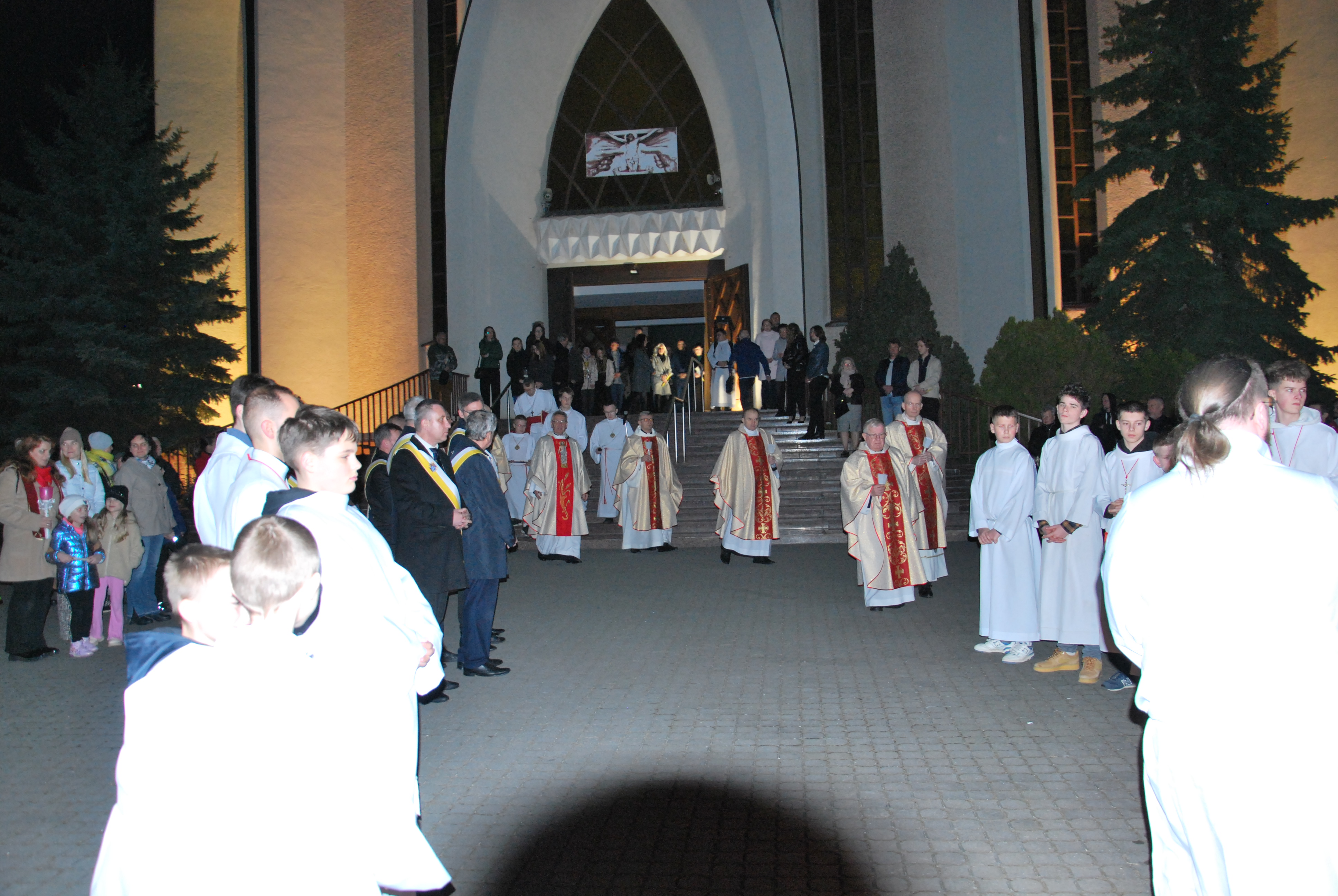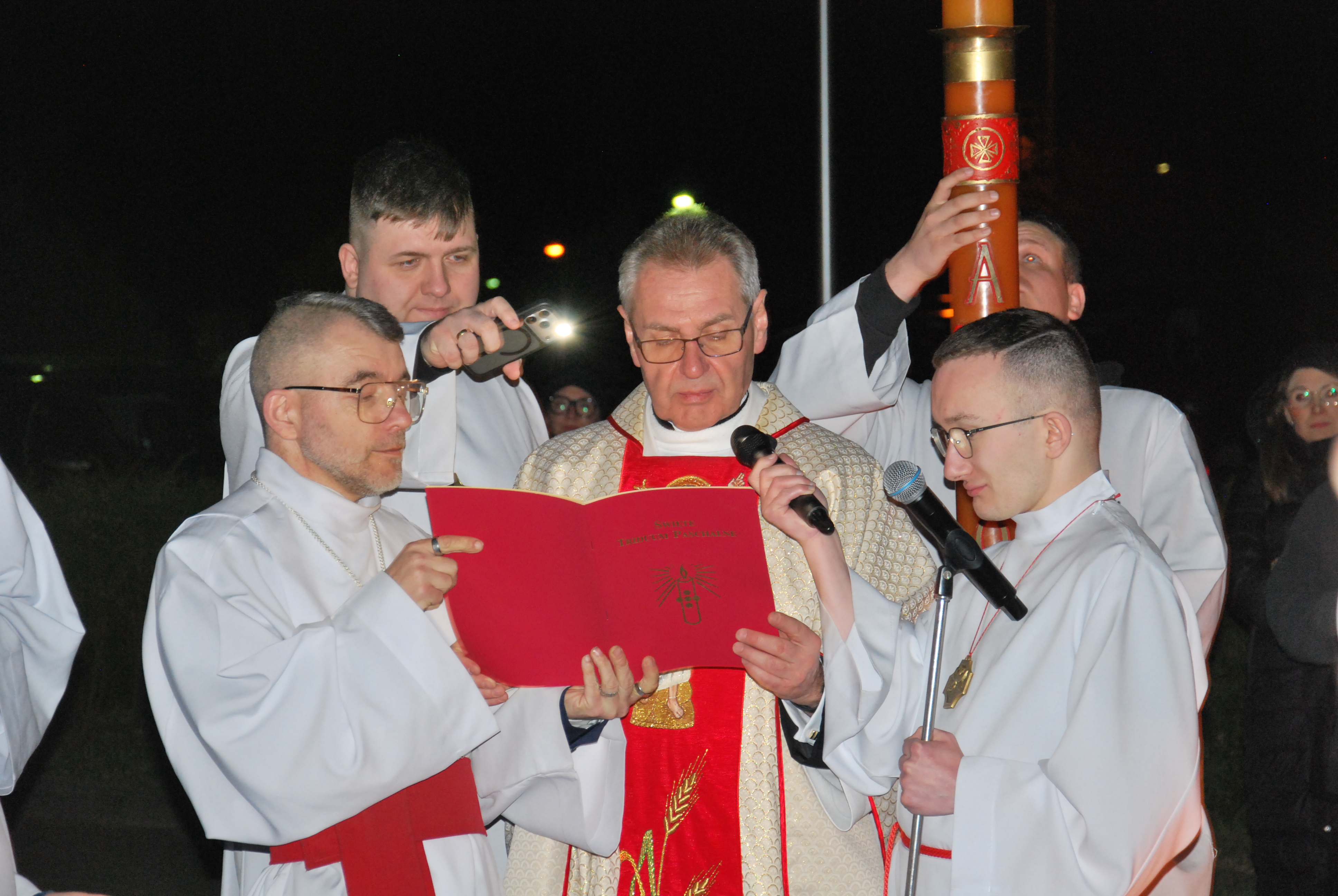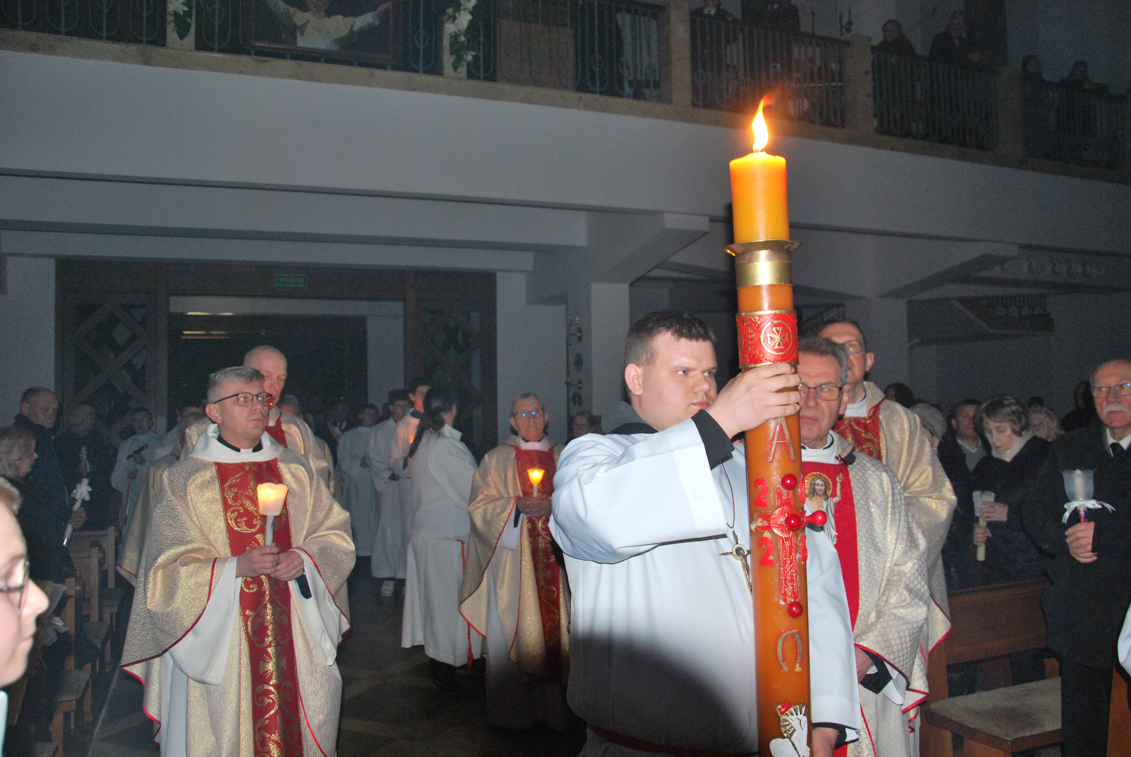 Liturgia rozpoczęła się na zewnątrz świątyni od obrzędu poświęcenia ognia. Od nowego ognia zapalono paschał – świecę symbolizującą Chrystusa Zmartwychwstałego, Światłość świata. Następnie w procesji wniesiono go do ciemnego kościoła, a światło stopniowo przekazywano wiernym, rozpraszając mrok i wprowadzając zgromadzonych w tajemnicę zwycięstwa życia nad śmiercią.