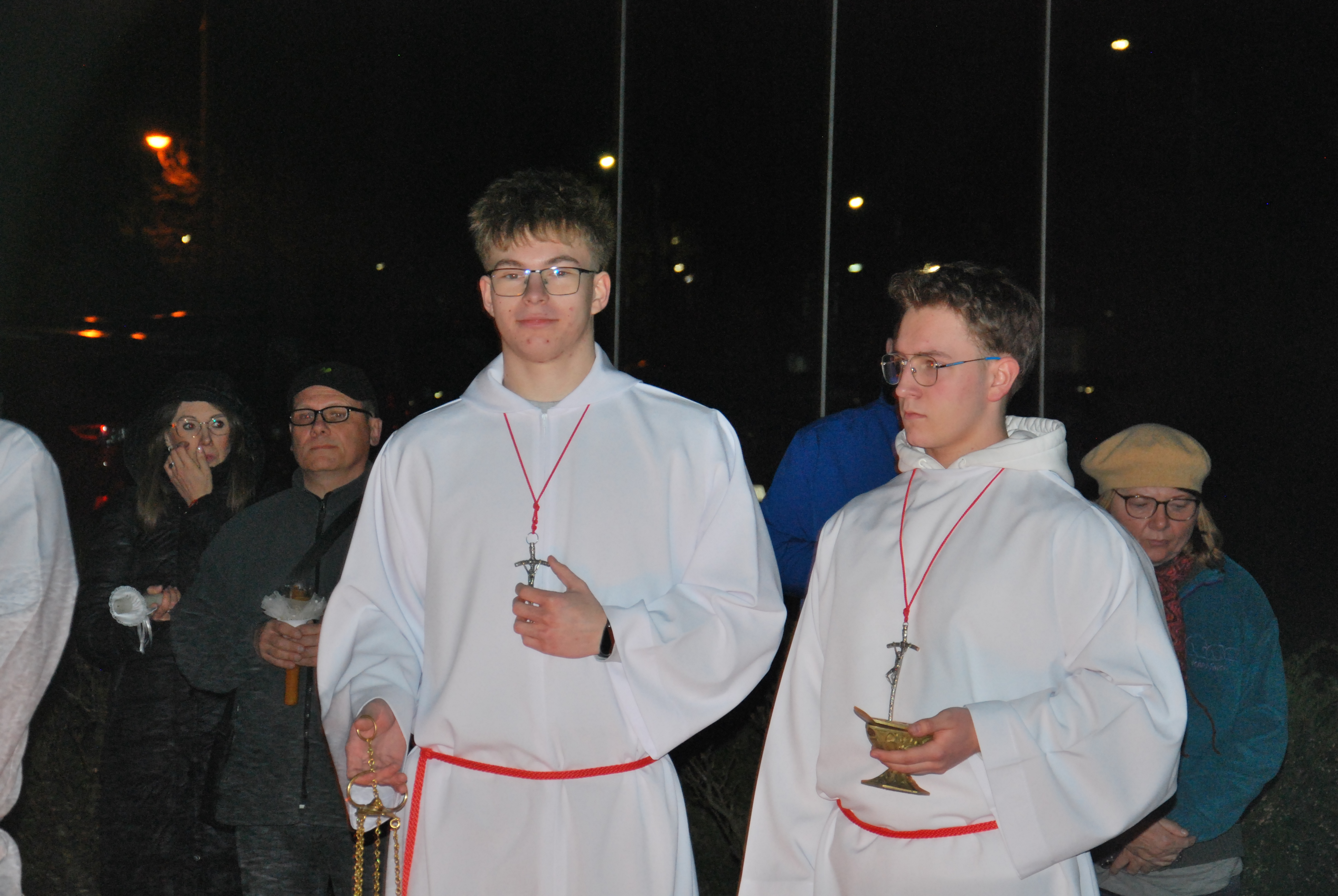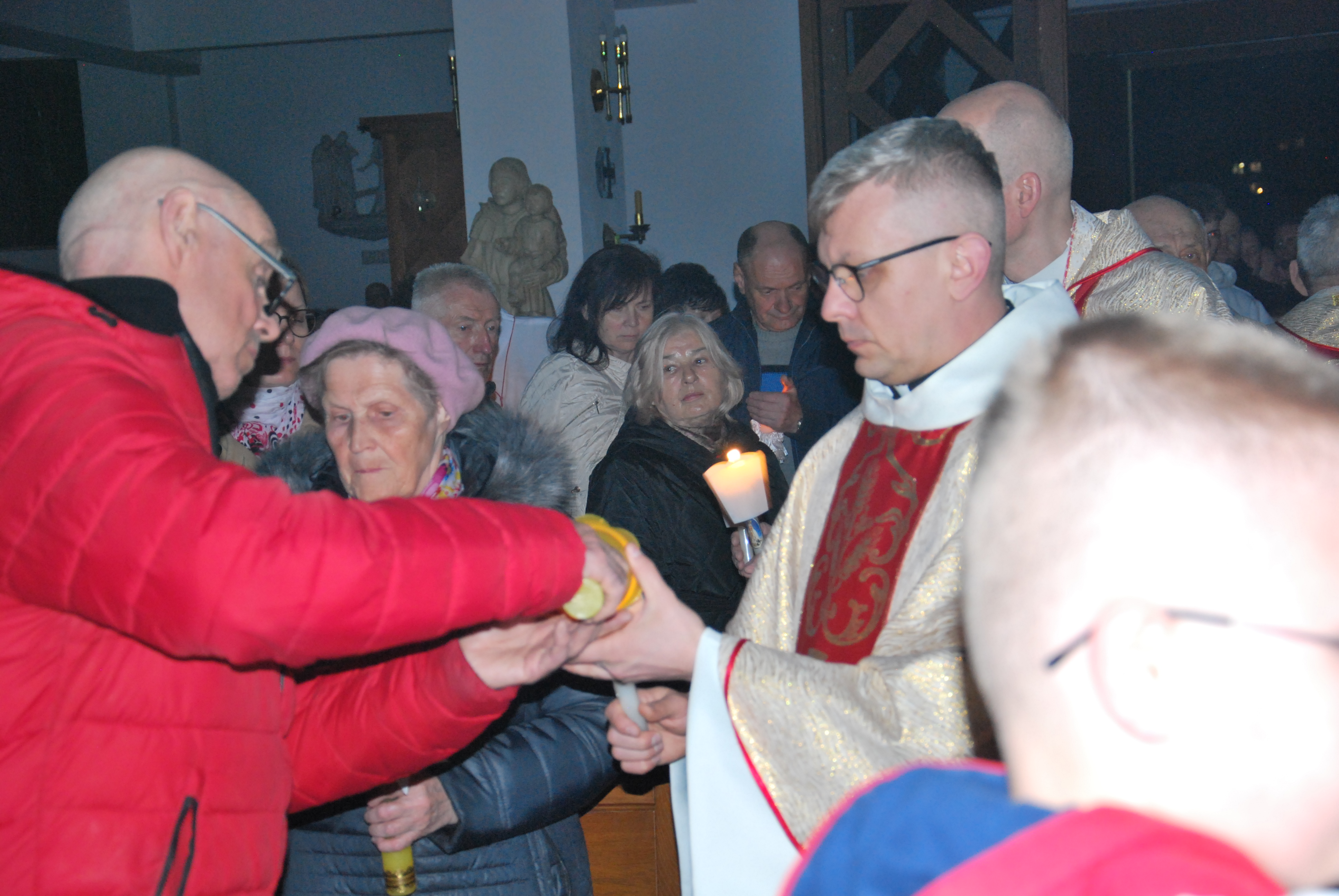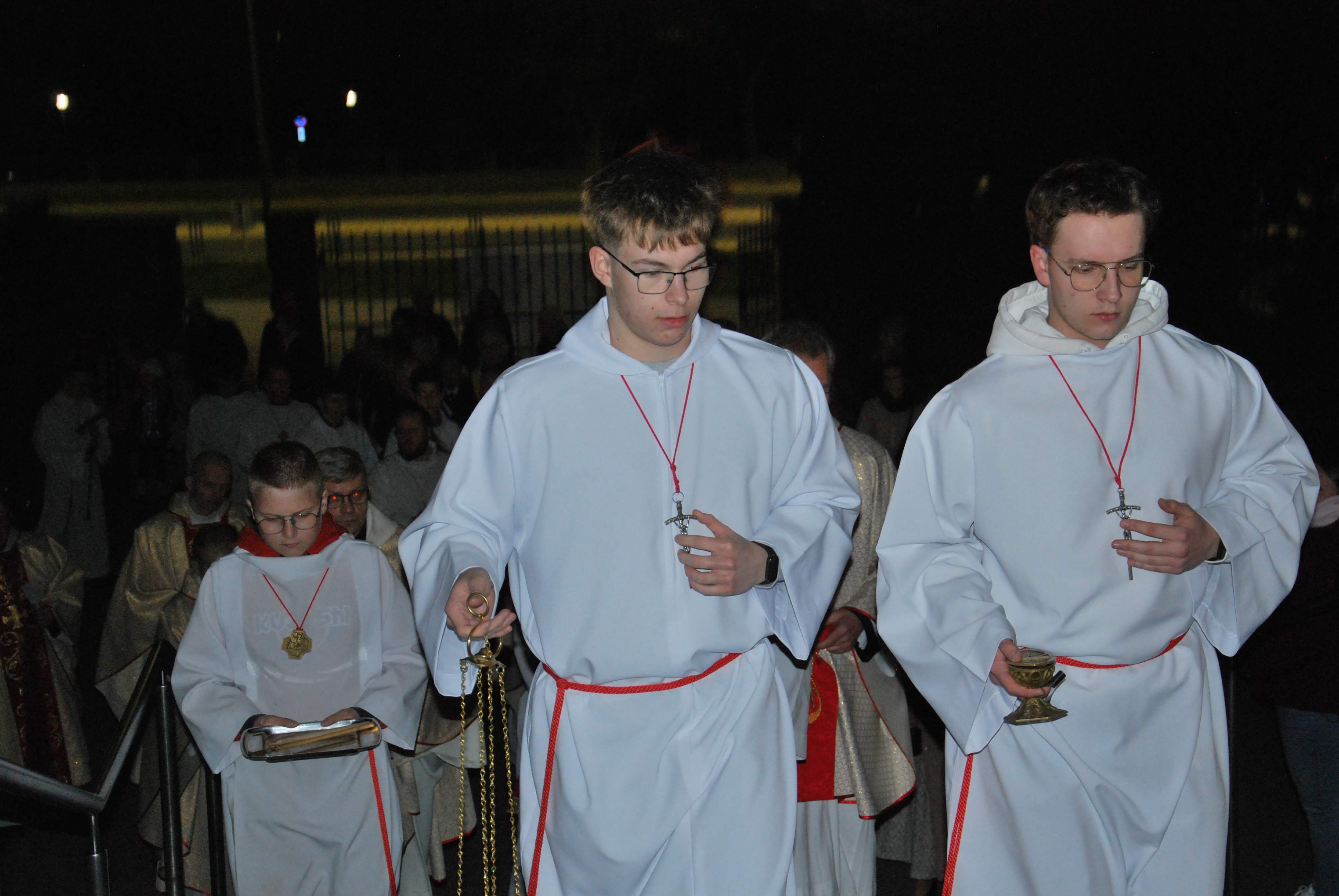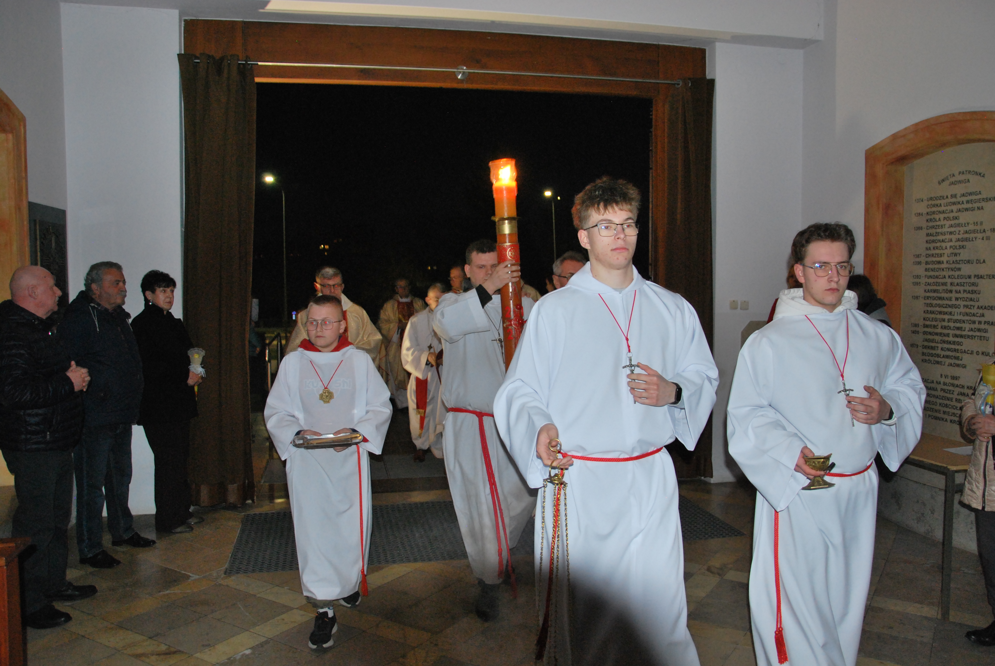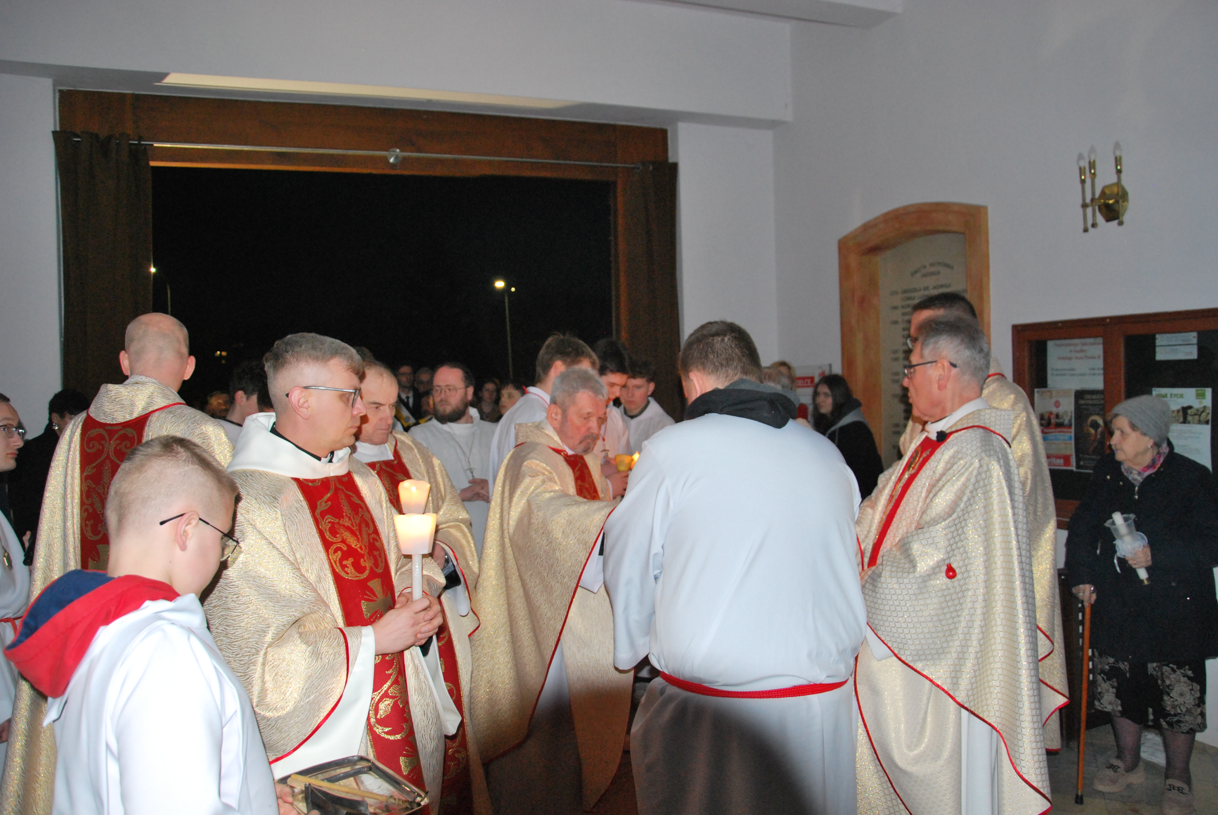 Liturgia rozpoczęła się na zewnątrz świątyni od obrzędu poświęcenia ognia. Od nowego ognia zapalono paschał – świecę symbolizującą Chrystusa Zmartwychwstałego, Światłość świata. Następnie w procesji wniesiono go do ciemnego kościoła, a światło stopniowo przekazywano wiernym, rozpraszając mrok i wprowadzając zgromadzonych w tajemnicę zwycięstwa życia nad śmiercią.