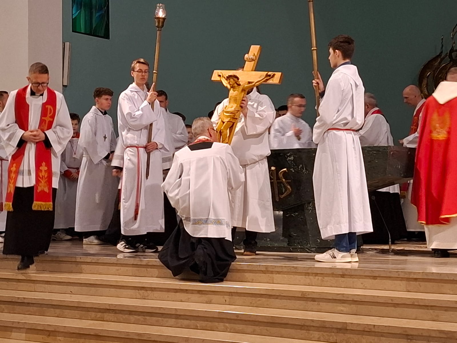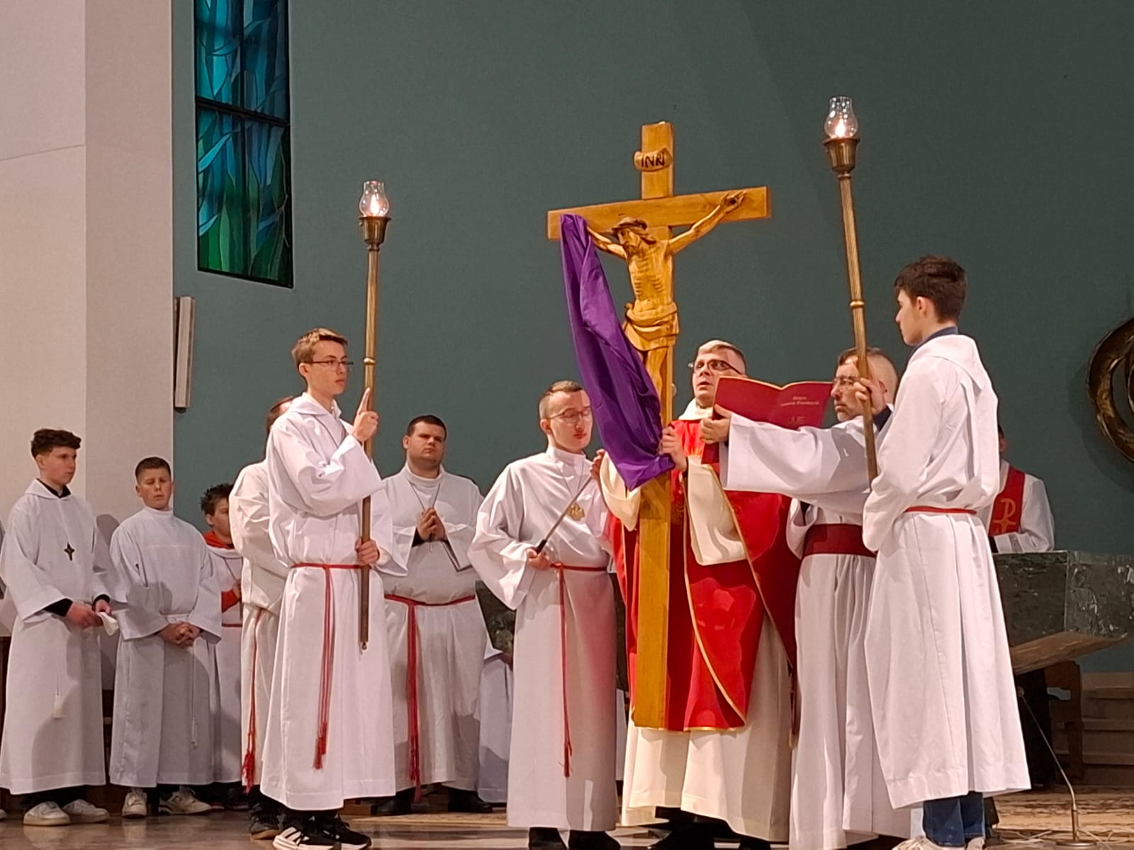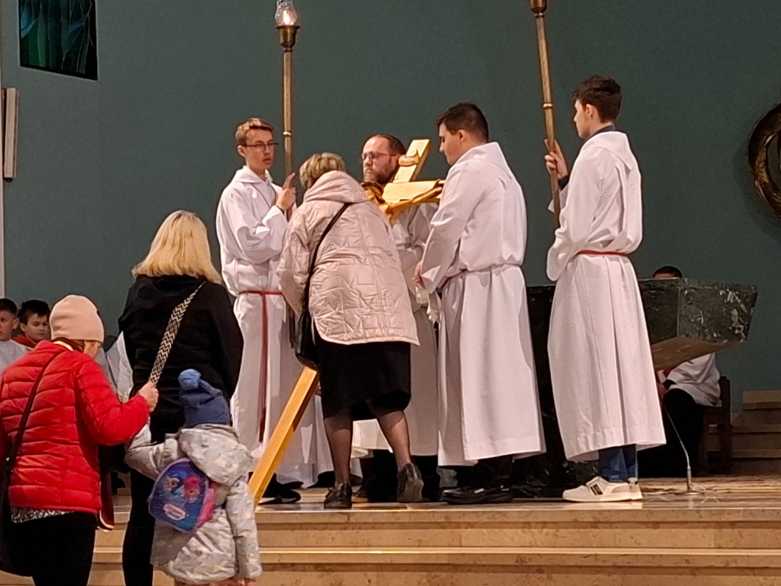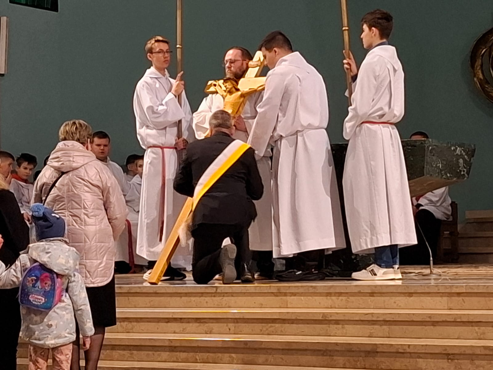 W Wielki Piątek wierni zgromadzili się na uroczystej liturgii Męki Pańskiej, której przewodniczył ks. Piotr Białek. Był to dzień szczególnej ciszy i skupienia, w którym Kościół nie sprawuje Eucharystii, lecz rozważa mękę i śmierć Jezusa Chrystusa.