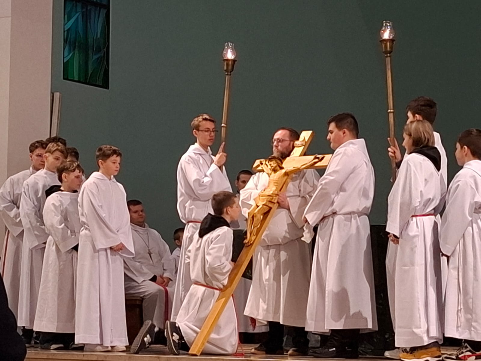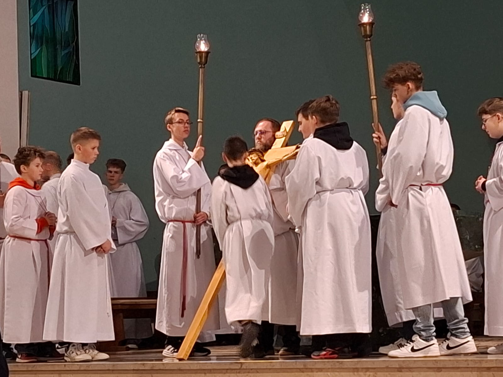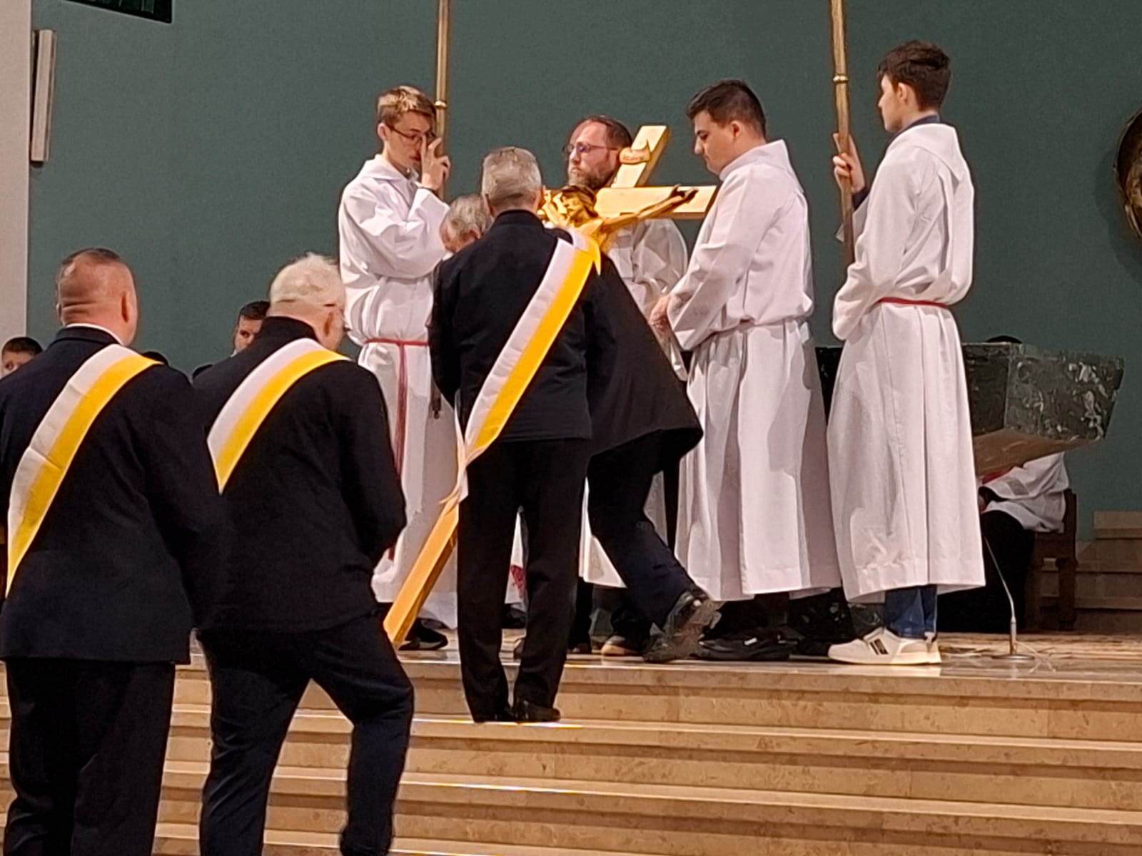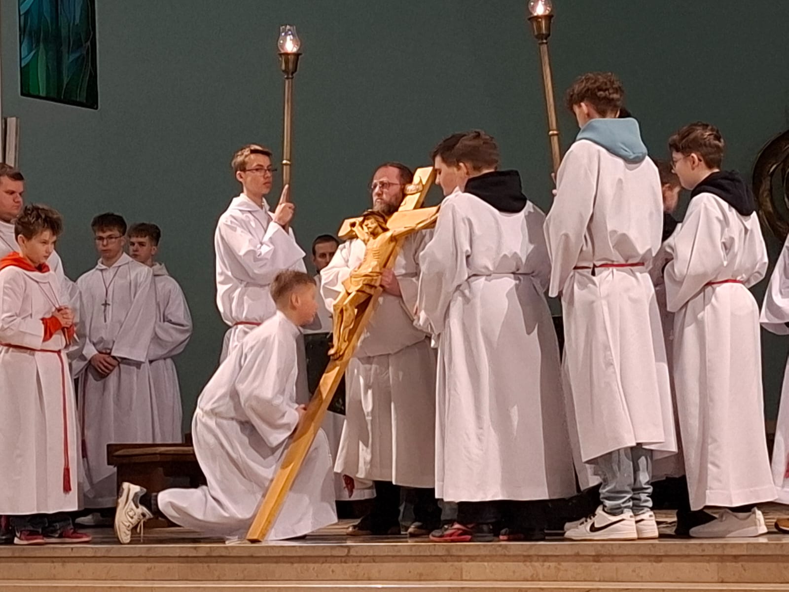 W Wielki Piątek wierni zgromadzili się na uroczystej liturgii Męki Pańskiej, której przewodniczył ks. Piotr Białek. Był to dzień szczególnej ciszy i skupienia, w którym Kościół nie sprawuje Eucharystii, lecz rozważa mękę i śmierć Jezusa Chrystusa.